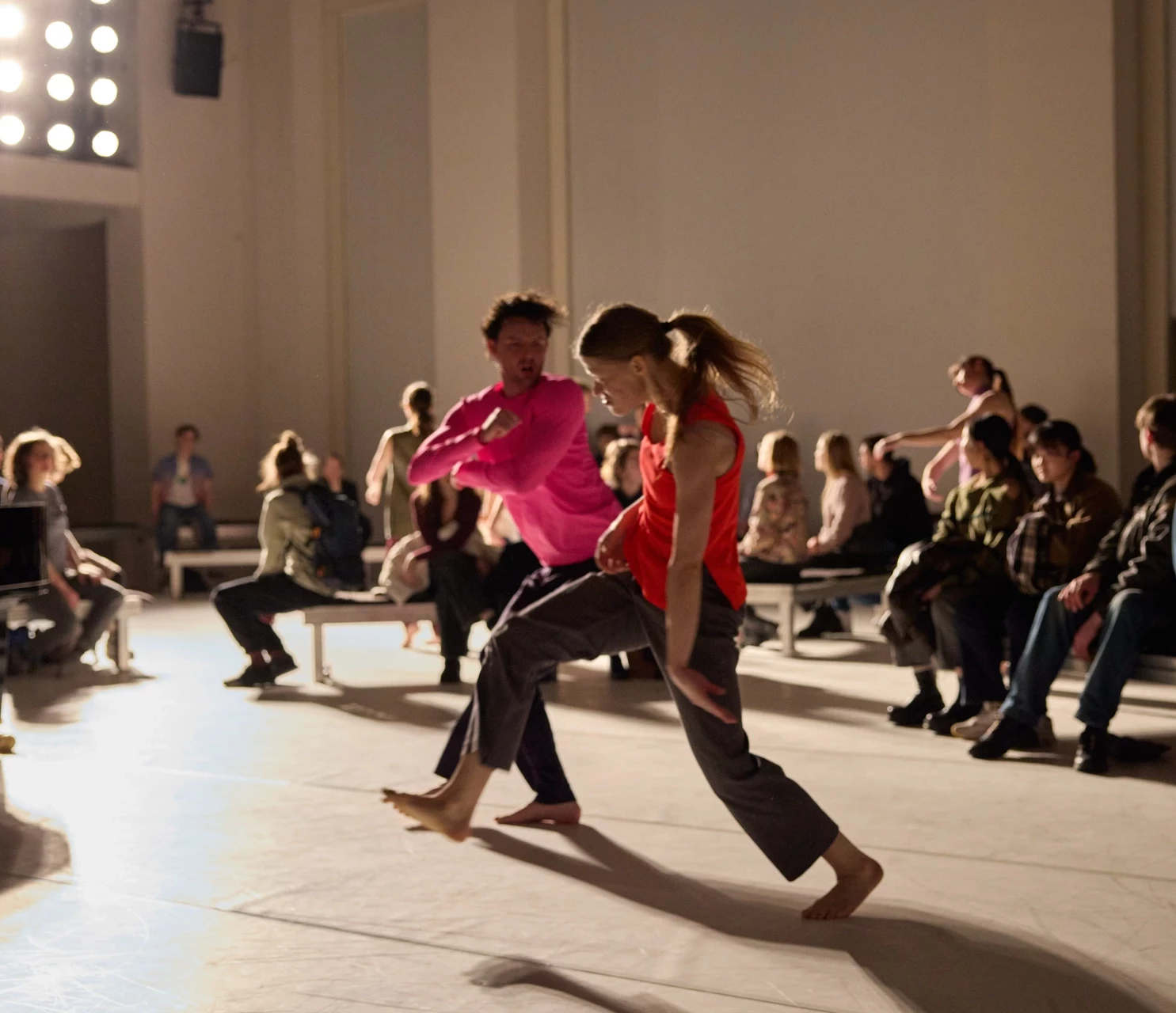 Die Aufführung entsteht jeden Abend in unmittelbarer Nähe zum Publikum und bietet so einen detaillierten Blick auf die Entscheidungsfindung der Tänzer*innen. Das Werk ist eine Zusammenarbeit mit Frédéric Blondy, Komponist und Improvisationspianist, dessen musikalische Sprache aus tiefem Zuhören, aus der Körperlichkeit der Bewegung und aus dem Erforschen von Klangfarben entsteht.