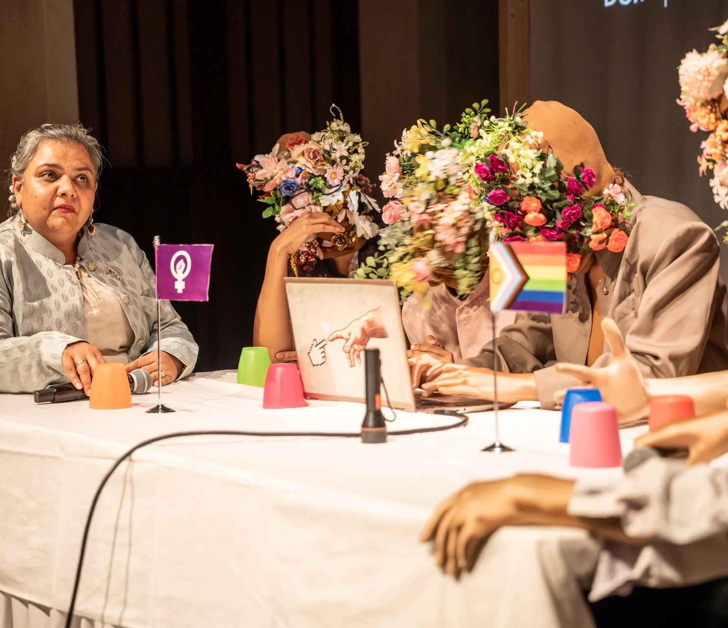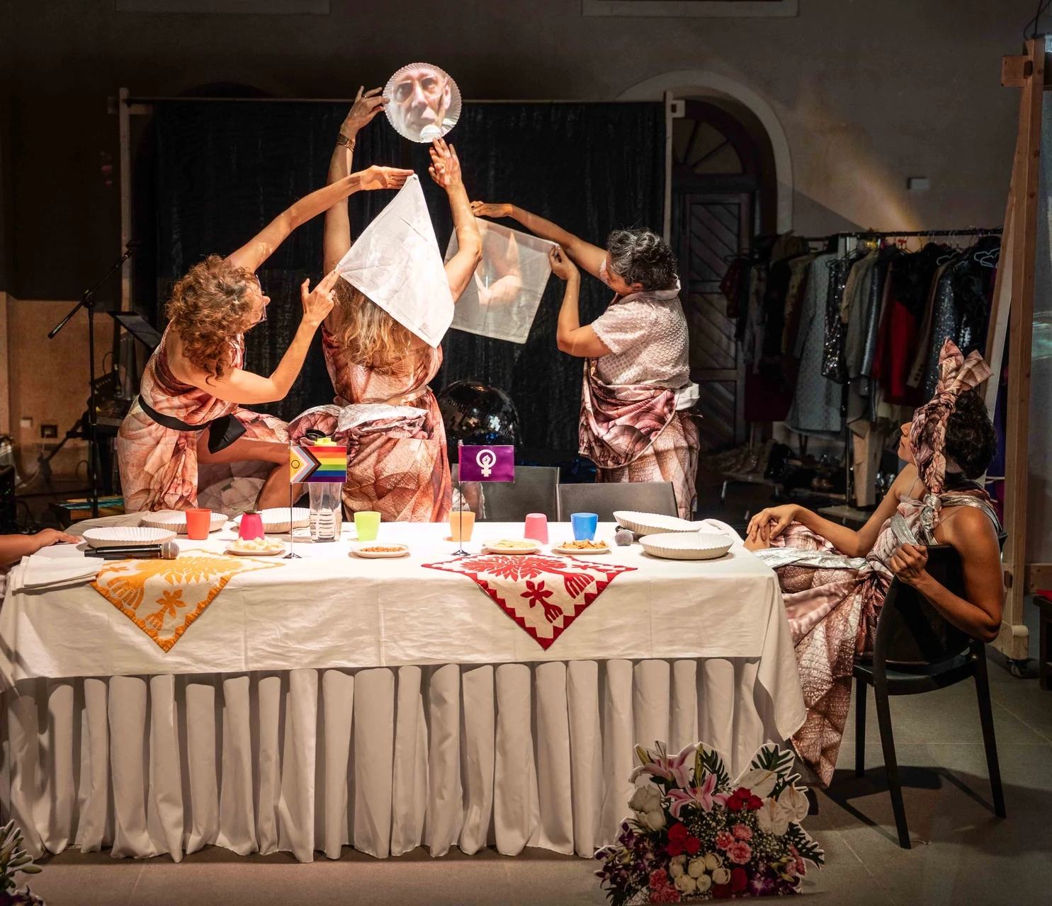 In „Wait To Be Seated“ begegnen sich zwei feministische Kollektive aus Bangalore und Berlin, um die Gesetze der Gastfreundschaft zu untersuchen. Das diplomatische Protokoll – seine peinliche Berücksichtigung wie auch gezielte Übertretung – dient als Vorlage für einen Austausch, bei dem wir gegenseitig zu Gastgeberin oder Gast werden und damit gleichzeitig zur Herausforderung, zur Verheißung und zur Bürde.
